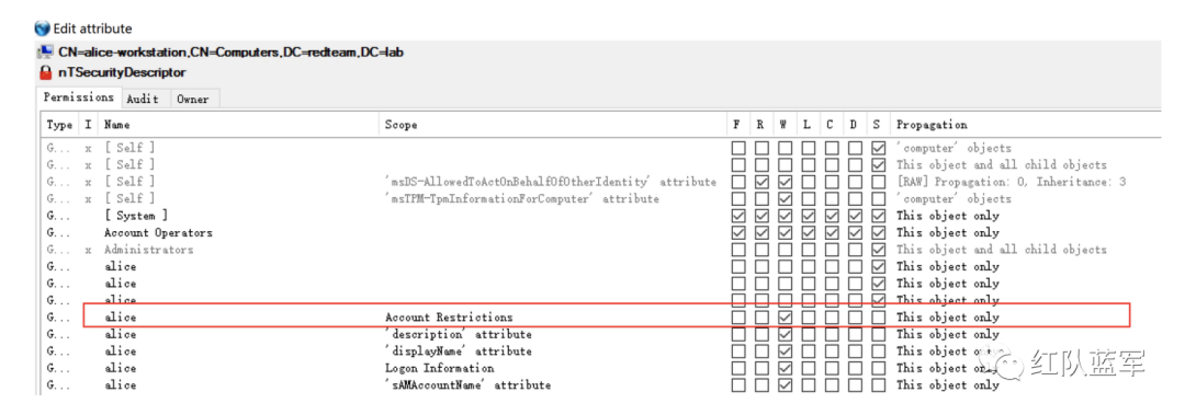 (1).creator-sid 用户:alice-workstation$由alice拉入域中,则alice默认就具有alice-workstation$的Account Restriction的WriteProperty权限
