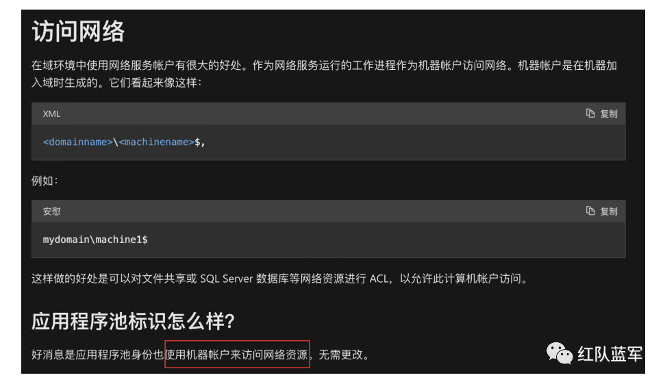 (https://docs.microsoft.com/en-us/iis/manage/configuring-security/application-pool-identities)官方文档中明确表示iis等服务用户以机 器账号(SYSTEM)请求网络资源。官方文档中明确表示iis等服务用户以机器账号(SYSTEM)请求网络资源。)