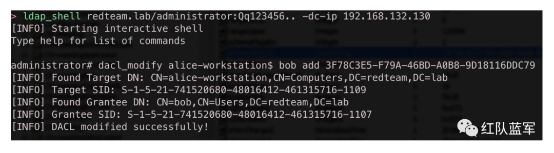 (2).拿下域权限后添加bob对alice-workstation$的msDS-AllowedToActOnBehalfOfOtherIdentity的WriteProperty权限 1.ldap_shell