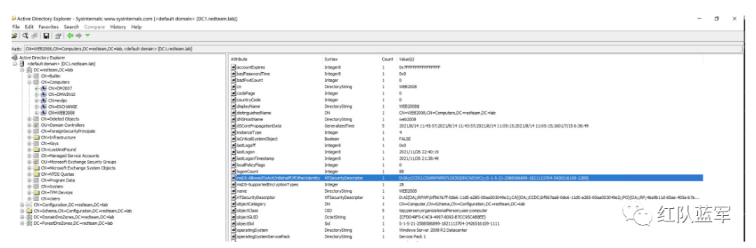 iis以机器账户请求域内资源,对其机器本身有WriteProperty权限,可以设置自身的msDS-AllowedToActOnBehalfOfOtherIdentity 字段来设置基于资源的约束委派。所以可以利用web2008创建域机器(此处为evilpc),并通过writelproperty设置evilpc到其的基于资源的约束委派。