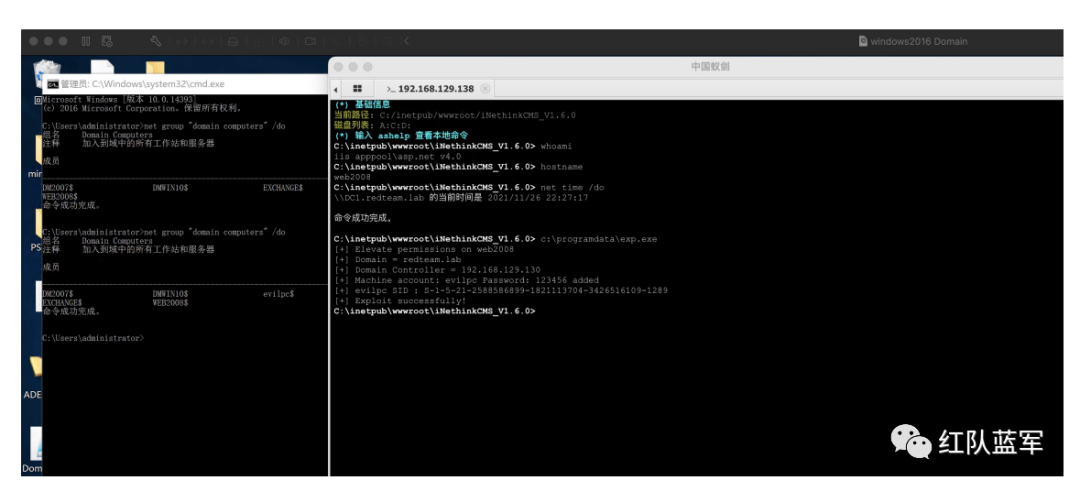 在域内域机器web2008上存在iis服务,攻击者拿到webshell后发现当前权限为iis,但是此用户依然是域用户,可以创建机器账 号;