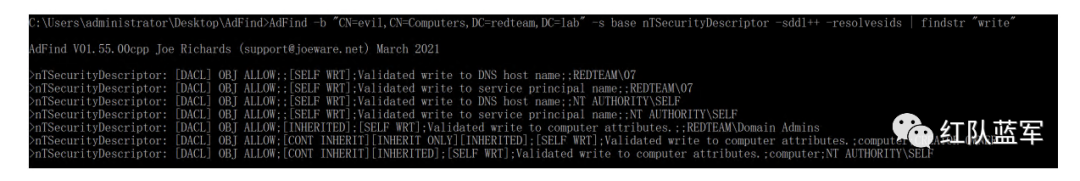 AdFind -b "CN=evil,CN=Computers,DC=redteam,DC=lab" -s base nTSecurityDescriptor -sddl++ -resolvesids | findstr "write”
