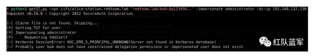在S4U2self阶段报错:Kerberos SessionError:KDC_ERR_S_PRINCIPAL_UNKNOWN。