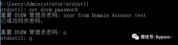 使用DSRM的密码和指定域用户test的密码进行同步,在命令行环境中使用ntdsutil工具重置DSRM管理员密码。