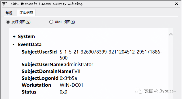 4794事件:每次更改目录还原模式(DSRM)管理员密码时,就会生成此事件,包含SID和帐户名,以及调用方工作站。