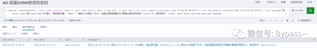 index=ad EventCode=4794 | stats count earliest(_time) AS start_time latest(_time) AS end_time by dest user| eval start_time=strftime(start_time,"%Y-%m-%d %H:%M:%S")| eval end_time=strftime(end_time,"%Y-%m-%d %H:%M:%S") | eval message="在"+start_time+"到"+end_time+"时间内,域控服务器:"+dest +" 疑似DSRM域后门行为,试图设置目录服务还原模式管理员密码"+count+"次,操作账号:"+user| table start_time end_time user message安全告警效果如下图:
