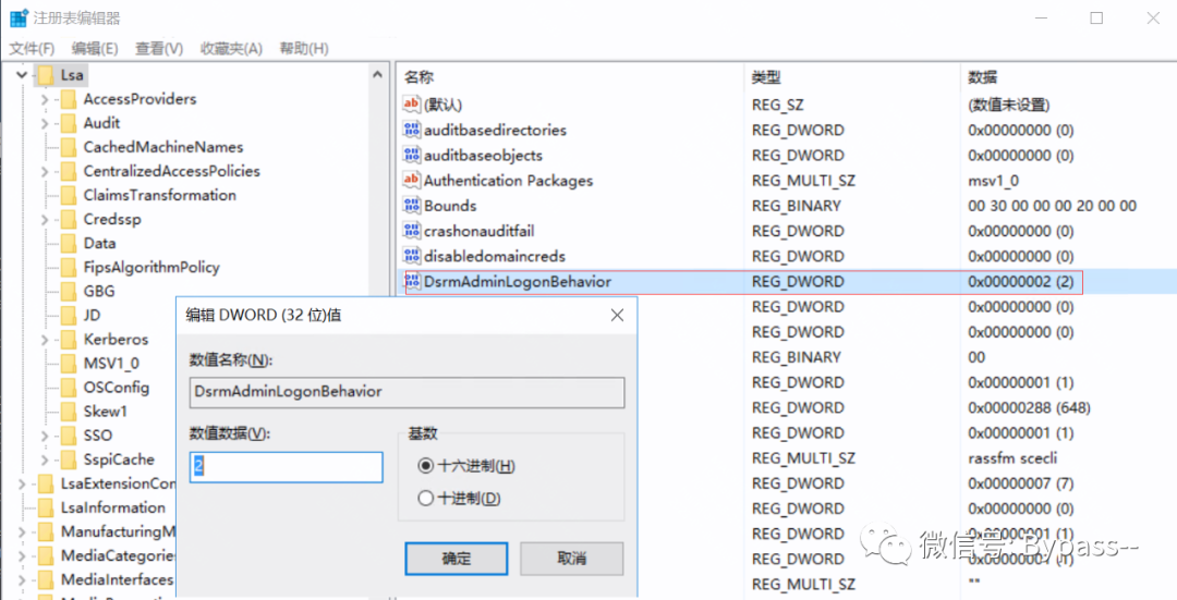 如果要使用 DSRM 账号通过网络登录域控制器,需要将该值设置为 2。