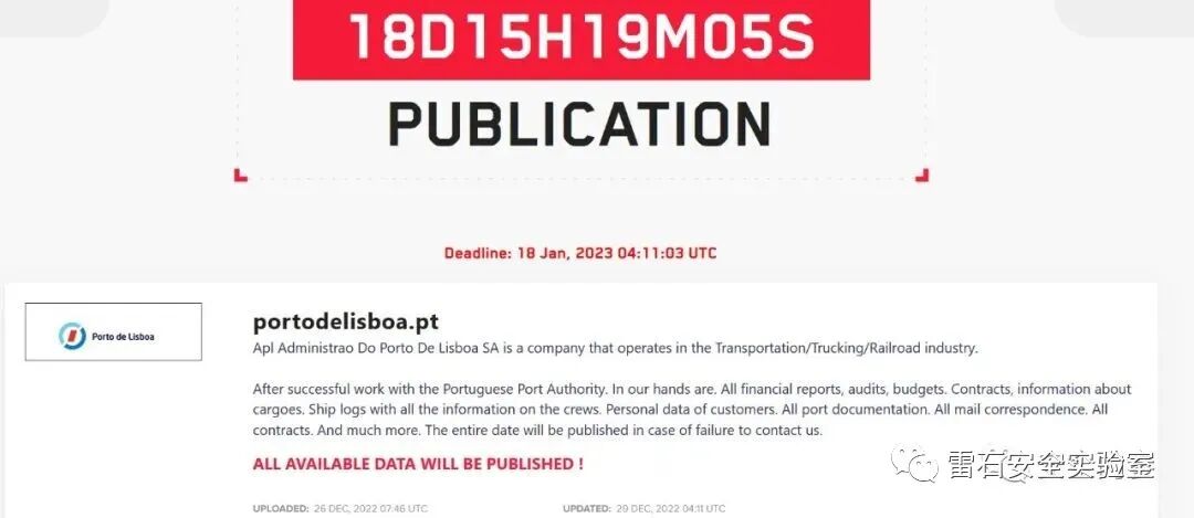 全球超级港口之一、葡萄牙最大港口里斯本港当地官员确认,由于遭受网络攻击,港口网站一周后仍无法正常访问。大约在同一时间,LockBit团伙将里斯本港列入其网站已勒索名单,声称发动了勒索软件攻击。