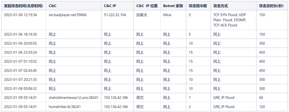 根据我们的监测,最早的攻击时间在北京时间 2023-01-06 12:19:34 左右,这一波攻击中 Mirai 僵尸网络的 C&C 共下发 5 条攻击指令,总攻击时长为 150s。在当天下午至夜间,攻击者又打出了 3 波攻击,并且一波比一波猛烈。攻击的最高峰发生在 2023.1.6 日 23:35 点至 2023.1.7 日凌晨 02:45 点这 3 个多小时内。最高峰这段时间,攻击者总共下发了 45 条攻击指令,打出了 3 波攻击,平均每波攻击持续 450s。根据这次攻击事件的时间先后顺序,我们整理了这几波攻击的详情:本次 Navicat 中文官网被 DDoS 攻击事件中,我们看到的都是 Mirai 僵尸网络参与,其中 xin.badplayer.net:59666 打出了最猛的攻击。这个 C&C 打出的 DDoS 攻击还是混合了多种 DDoS 方式的攻击,通常来说,这种攻击手法会明显提高攻击成功率,也会给防护带来一定的困难。三个参与 DDoS 的 C&C 域名中,homehitter.tk、shetoldmeshewas12.uno 经过分析确定属于同一攻击团伙,因为这两个域名都指向同一IP地址 103.136.42.186,并且当前能在服务器获取到完全相同的僵尸网络样本文件。