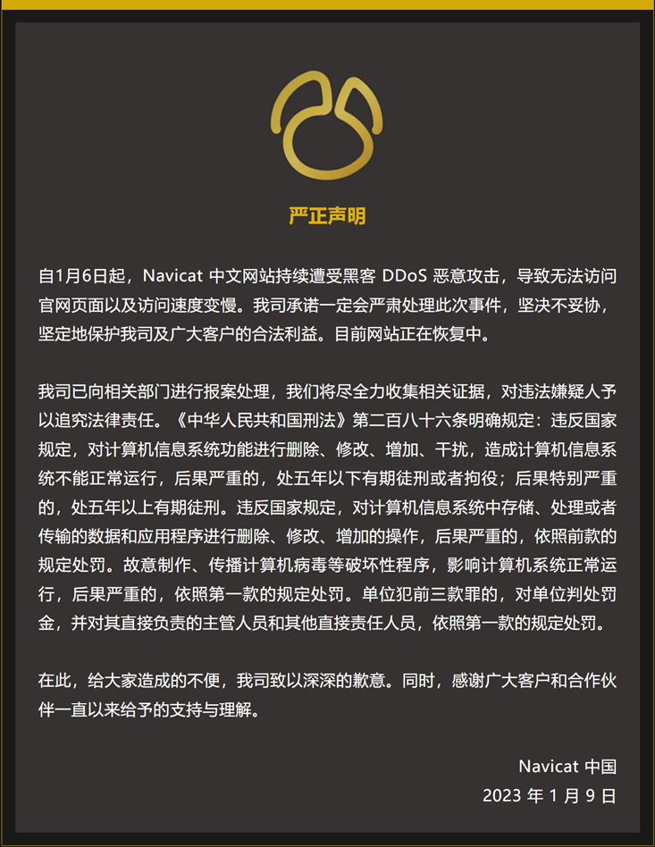 1. 概况2023.1.9 日上午,Navicat 官方微信公众发布了一篇通告 《紧急 | 关于遭受网络黑客攻击的声明》,公开自家中文官网自 1 月 6 日以来被断断续续的 DDoS 攻击至影响正常访