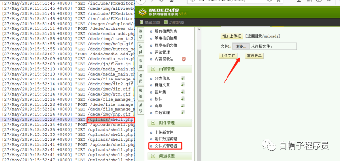 经测试发现在网站后台“文件式管理器”处可以上传任意php文件,所以入侵者就直接上传了shell.php大马