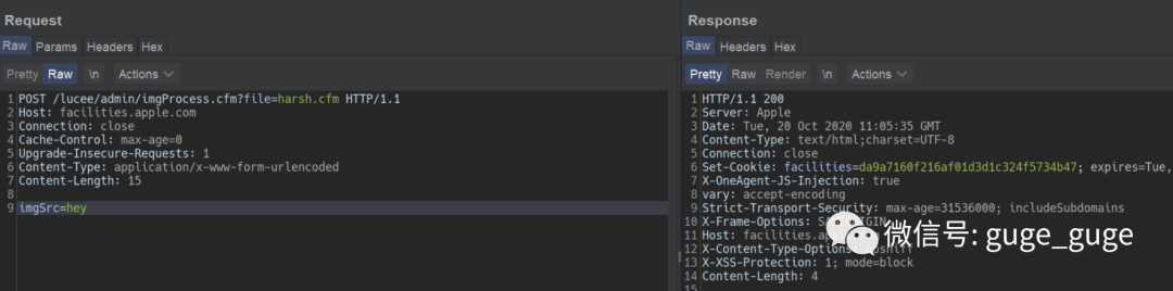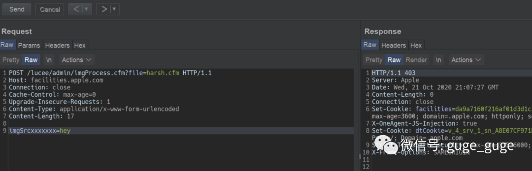 为了复刻 Apple 的安装,该团队在本地运行了相同版本的 Lucee ,在没有任何参数的情况下打开 imgProcess.cfm 会使安装出现异常,在 Apple 的服务器上打开它时会返回403,这意味着该文件是存在的,那么就意味着必须指定正确的参数/值,否则后端服务器将会异常,前端服务器将为该异常返回403错误。