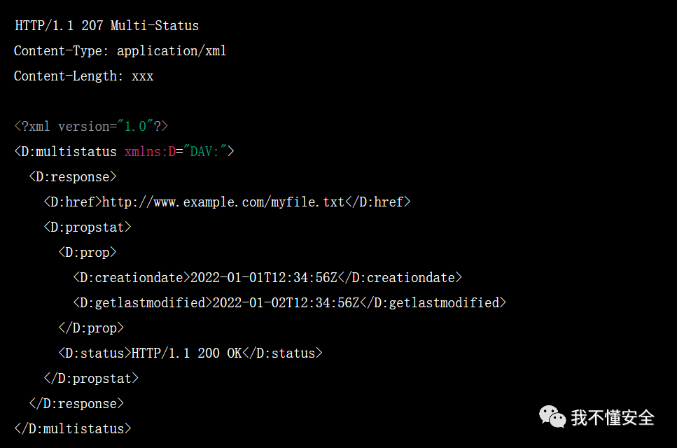 服务器响应的状态码为 207 Multi-Status,并在响应主体中包含所请求的属性信息。