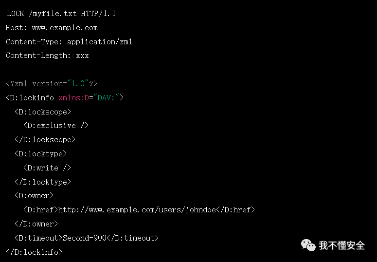 使用 LOCK 方法时,客户端向服务器发送 LOCK 请求,并在请求主体中包含锁定信息。服务器会返回一个锁定标识符 (lock token),客户端可以使用该标识符在之后的请求中引用该锁定。我们以锁定900秒进行测试