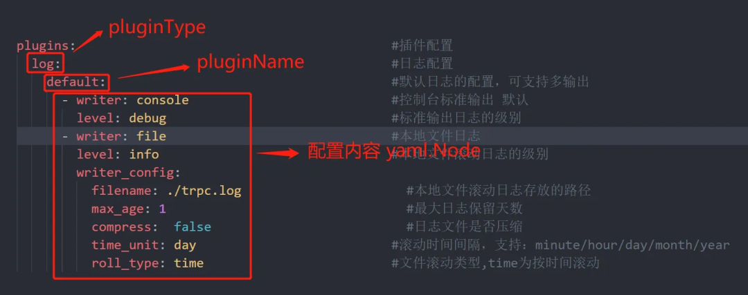 trpc-go 约定了一种配置格式,插件的配置都按那种格式配置到 trpc.yaml 中,然后 trpc-go 根据插件名找到对应插件,然后把该插件的配置分离出来,用这部分小配置去实例化插件。这样对插件唯一的约束就是插件必须要支持通过 yaml 格式进行配置,至于 yaml 配置的格式完全可以自定义。