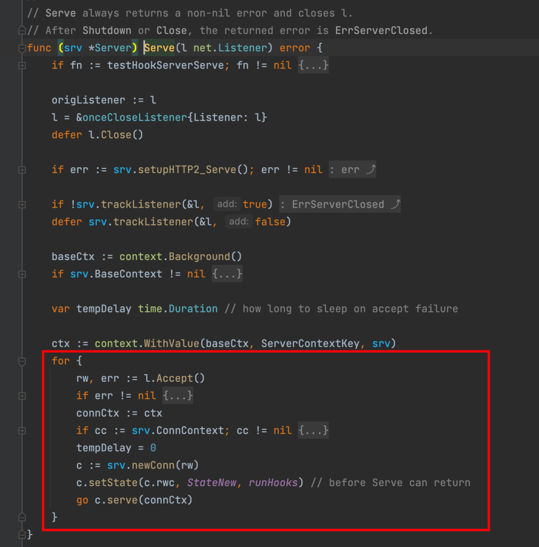 把分支代码收起来,只看主干,发现是一个 for 循环里面在不停地 Accept,而这个 Accept 在没有连接时是阻塞的,当有连接时,起一个新的协程来处理。