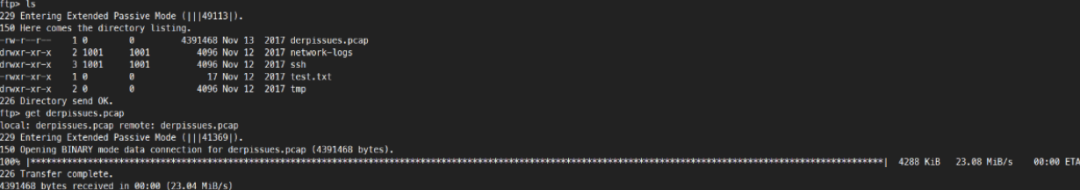 [email protected]:~/Documents$ mv derpissues.pcap ~/ftp/files/然后使用ftp把文件传到本地