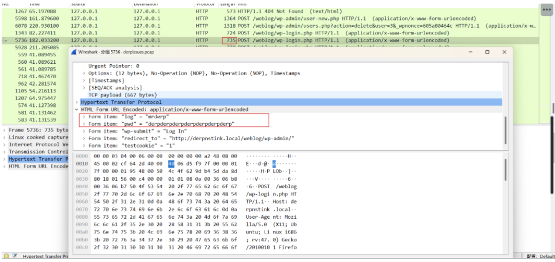 分析pcap文件,寻找http请求包,找到wp-login登录请求,735长度的报文数据存在账号密码