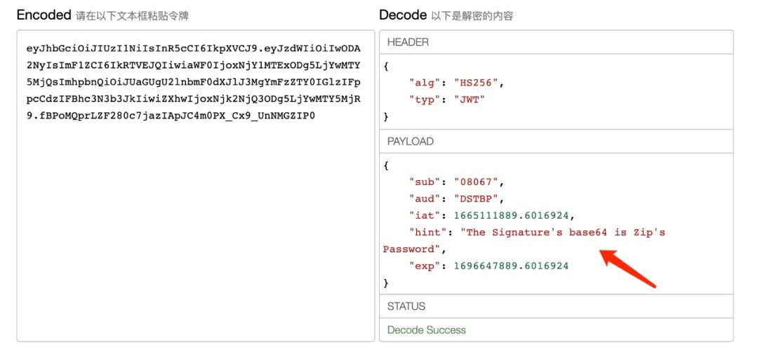 eyJhbGciOiJIUzI1NiIsInR5cCI6IkpXVCJ9.eyJzdWIiOiIwODA2NyIsImF1ZCI6IkRTVEJQIiwiaWF0IjoxNjY1MTExODg5LjYwMTY5MjQsImhpbnQiOiJUaGUgU2lnbmF0dXJlJ3MgYmFzZTY0IGlzIFppcCdzIFBhc3N3b3JkIiwiZXhwIjoxNjk2NjQ3ODg5LjYwMTY5MjR9.fBPoMQprLZF280c7jazIApJC4m0PX_Cx9_UnNMGZIP0