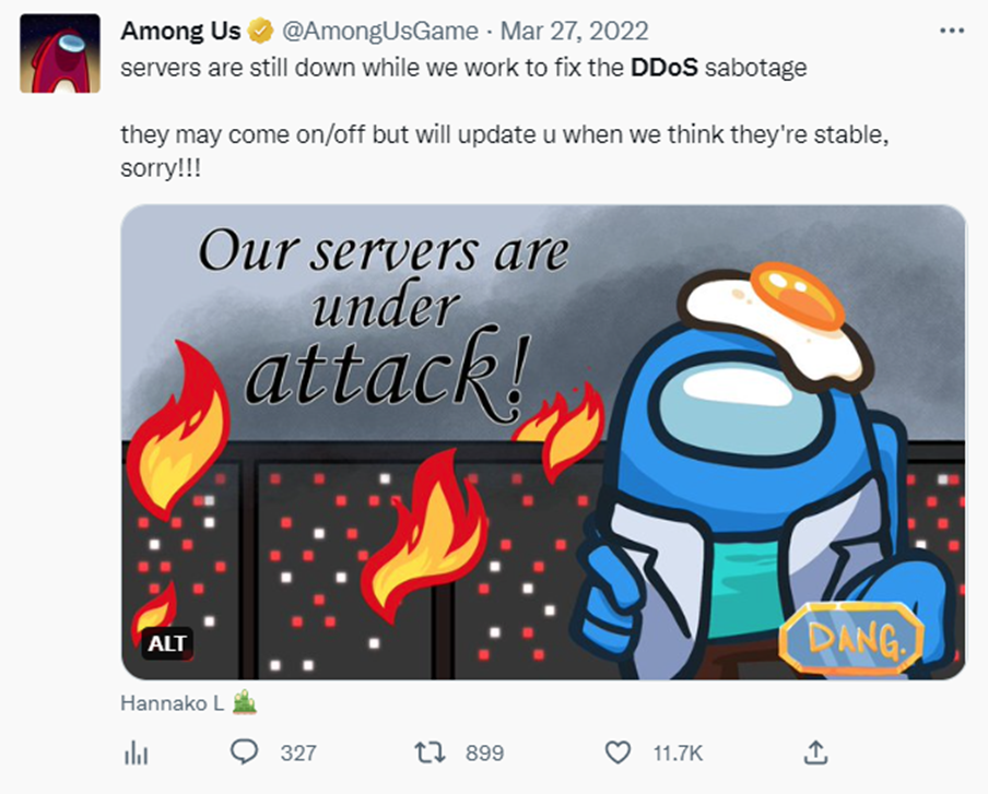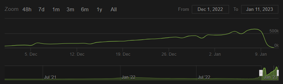 攻击者本次DDoS攻击中使用了多种攻击方式,分别包含了udp_flood、tcp stomp、syn_flood、tcp_ack_flood、udp_plain_flood,以此来提高攻击成功率。而在2022年11月份针对鹅鸭杀的DDoS攻击事件中,攻击指令在北京时间 2022-11-13 02:50:30 左右下发,攻击者所针对的资产不同与本次不同,目标服务器为 172.65.248.161 。下发指令的 Mirai 僵尸网络的 C&C 地址为 "78.135.85.160:9506",在这一次的攻击中攻击者仅使用了单一的UDP flood攻击。按照上述分析,同时根据我们对这两个 C&C 域名的长期监控数据,本次2023年1月份针对鹅鸭杀的DDoS攻击与去年监控到针对鹅鸭杀的DDoS攻击并未使用相同的第三方 DDoS 攻击租赁平台,同时由攻击时间及受害资产推测,很可能不是同一发起者,结合攻击手法和最后结果也可以知道到本次的攻击更具破坏性。由于本次的DDoS攻击事件,鹅鸭杀官方将服务器暂停维护3天,对于游戏服务器来说三天的维护时间对其玩家量的冲击是巨大的,通过对鹅鸭杀的游戏在线热度查询可以发现,鹅鸭杀的热度一直持上升趋势,而最近几次的游戏热度下降几乎都与DDoS攻击导致的服务器卡顿有关:在对本次事件的分析中,还有另一款游戏引起了我的注意,这款游戏名为 Among Us ,中文名《太空狼人杀》,与鹅鸭杀有着相同玩法的这款游戏于2018年6月15日发布,在2020年9月拥有6000万位活跃玩家,该游戏在运营过程中后同样遭受了DDoS攻击导致服务器关闭(奇安信威胁情报中心僵尸网络威胁监测系统已监测,攻击者为 Moobot 家族僵尸网络):