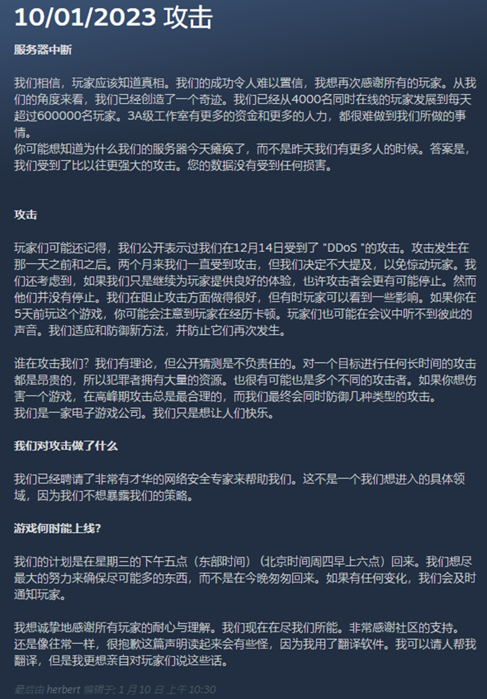 1. 概况2023.1.10 日上午,鹅鸭杀官方于Steam论坛上发布了公告,公开其服务器自2022年12月14日以来被断断续续的 DDoS 攻击,DDoS攻击在今年一月份开始变得更加强大,从最开始影