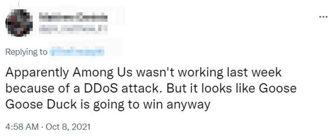 而 Among Us 的多次攻击事件导致的服务器卡顿甚至关闭也将其部分玩家引流到了 Goose Goose Duck ,也就是现在的鹅鸭杀: