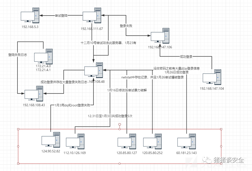 后来我们发现所有的登录爆破都来自于192.168.111.67,但是这台服务器一直找不到责任人,最后我通过暴力破解弱口令登上了这台服务器,并且发现了入侵者的攻击痕迹。在查找入口点的过程中,我画了简单地攻击拓扑图,来方便我来确定最后的入口点。