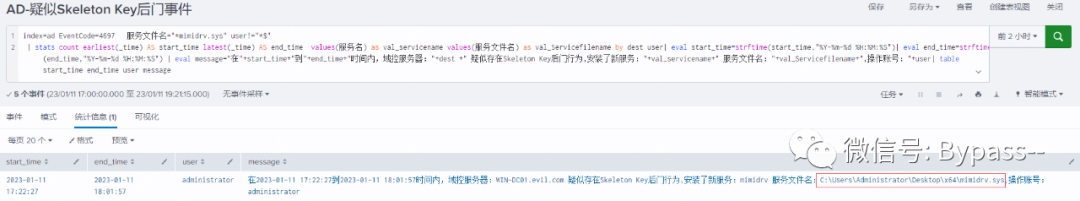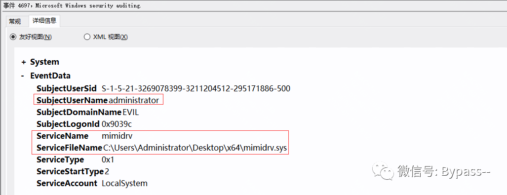 当攻击者尝试加载mimidrv.sys驱动时,将会生成4697事件,这个行为可作为安全日志中最为明显的特征进行识别检测。