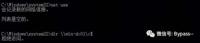 (1)尝试以当前用户身份,查看当前网络资源的连接为空,列出域控C盘共享目录中的文件显示拒绝访问,表示当前用户无权限。