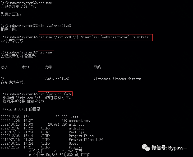 (3)使用域内管理员帐户和skeleton key尝试与域控制器成功建立连接,可列出域控制器C盘共享目录中的文件。