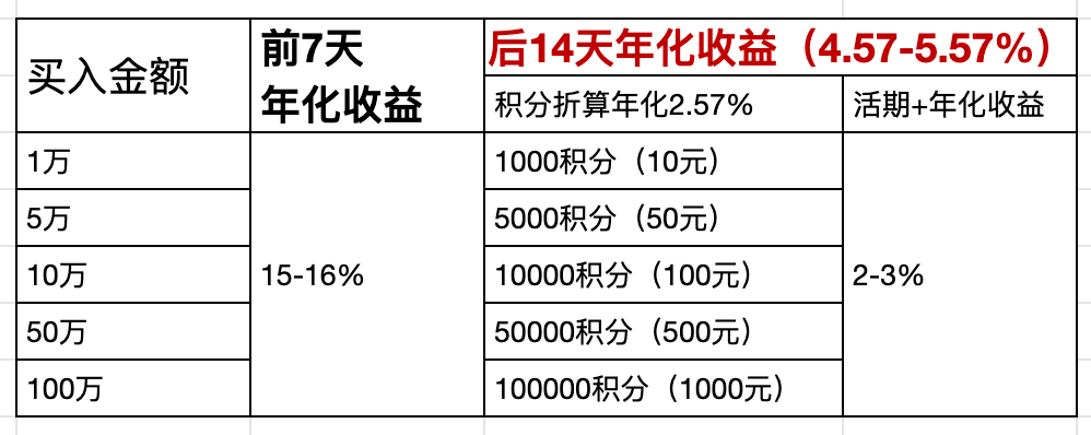 或者家里的闲钱备用金之类的,也可以拿来参与这个活动,反正都是买货基不怕亏,这里还有京东卡送。后14天的收益构成如下表,年化5%左右的稳当收益也算是相当高了,没活动的话也就是2%的年化收益率吧,现在逆回购也是2.5%左右。闲置资金都可以来参与一下,100万的奖励积分能兑换1000元,比逆回购高2-3%。![]()