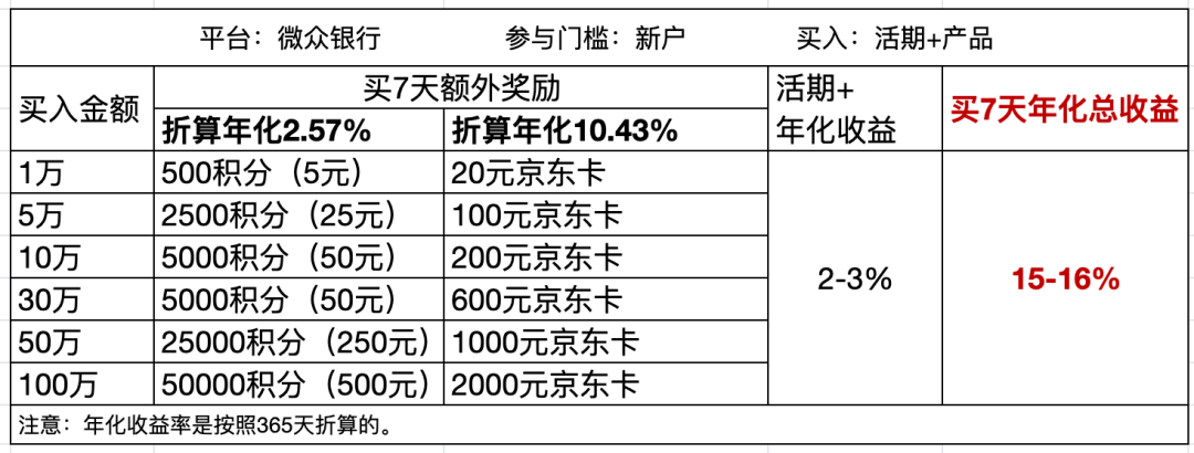 虽然是民营银行,但背靠腾讯,实力摆在那,所以安全问题不用担心,而是我们也不是买三五年的存单,就放几天几个月的,没事。很久之前注册过但没入金的也可以,主要是没拿过微众银行的新户奖励。前7天的收益构成如下表,买100万,不仅能拿年化2-3%的活期+收益,额外还有2000元京东卡+500元积分,而卖逆回购的话也就不到500块钱。![]()