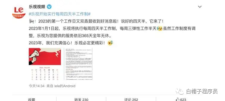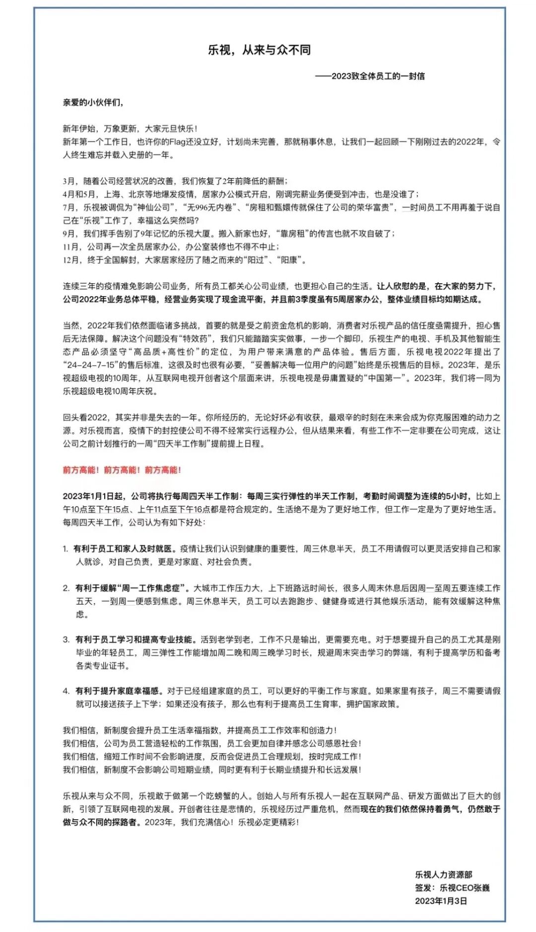 近几天《乐视,从来与众不同》至2023年全体员工的一封信,让乐视又火了,一封信里通知员工,一周只需上班4.5天,真应那句,“老板不在家,东西给钱就卖”