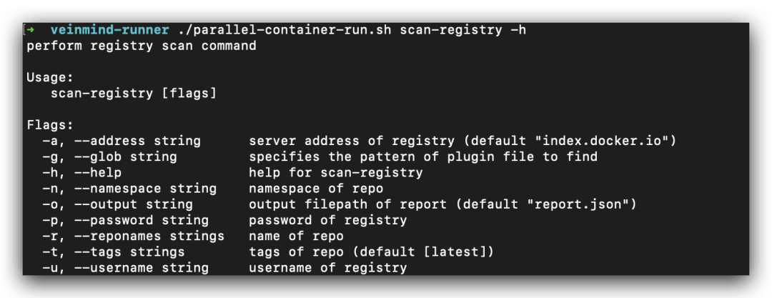 ./parallel-container-run.sh scan-registry -h ,查看扫描远程仓库命令参数